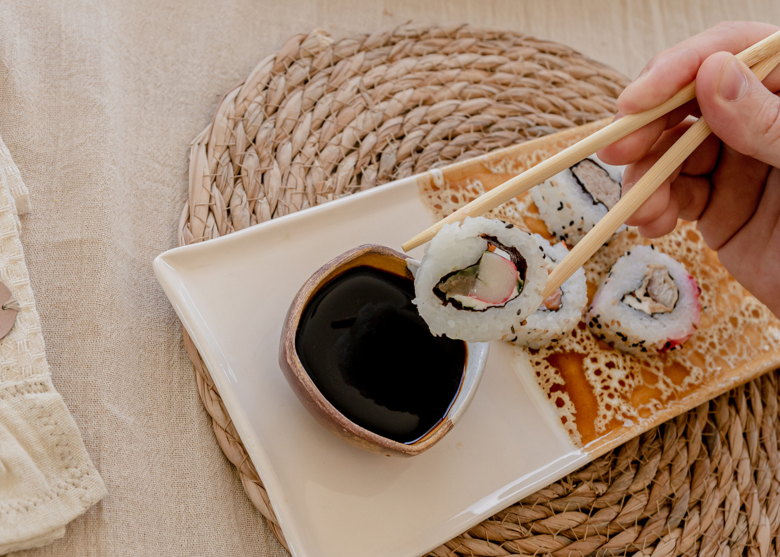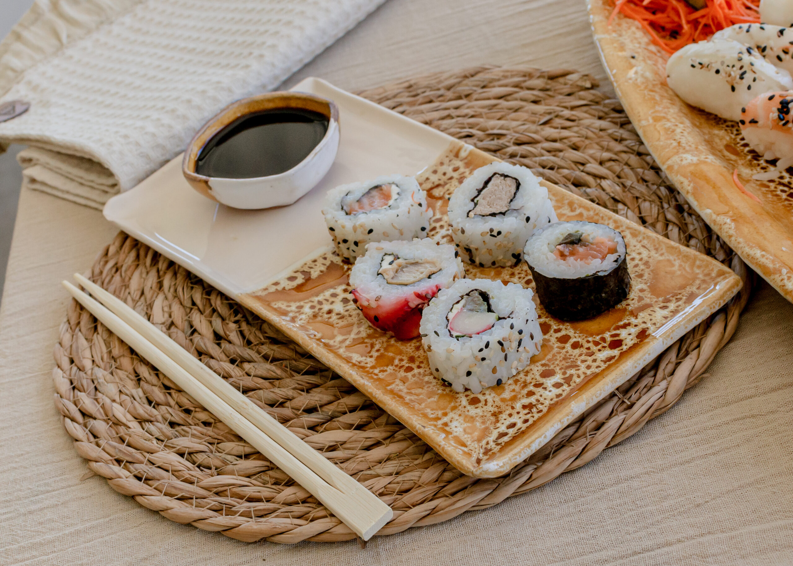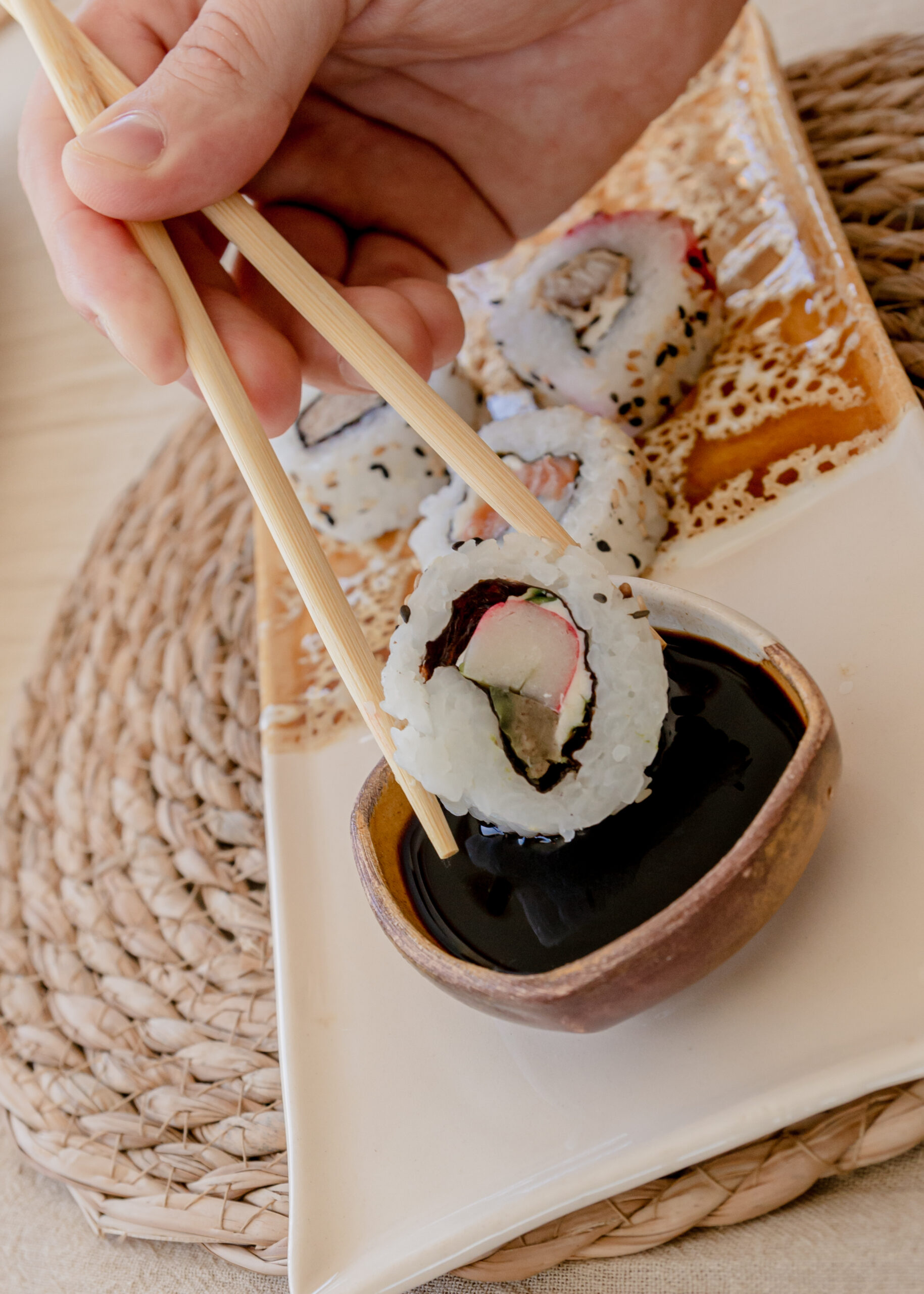 Set de Sushi rectangular personalizado Línea Mumbay / Bandeja: 20 cm por 10 cm – Cuenco: 5 cm de diámetro